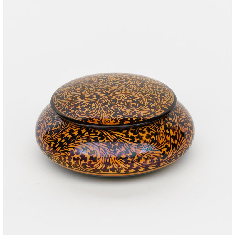 A Pilkington's Lancastrian box and cover by Gladys Rogers, circular with low domed cover, painted with scrolling foliage design in brown on a mustard yellow ground impressed marks, painted artist cipher, professional restoration to cover, 15cm. diam. (2)