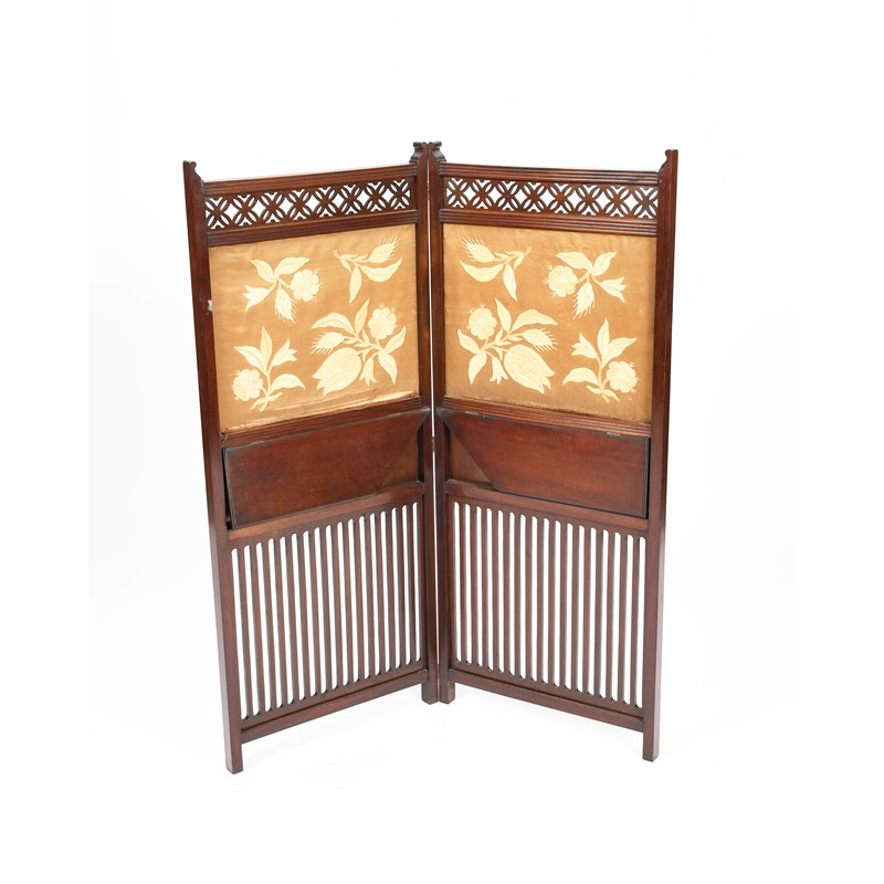 An Aesthetic Movement mahogany two-fold screen, with pierced rails and two hinged shelves, set with embroidered silk panels of flowers and foliage unsigned 109.5cm. high, 90cm wide