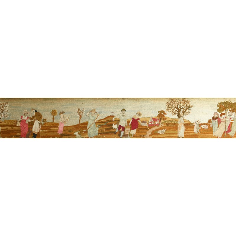 An Aesthetic Movement ebonised wall shelf with silk embroidered Nursery Rhymes panel, the panel designed by Walter Crane, with vignette featuring Where Are you Going my Pretty Maid and Little Bo Peep from Baby's Opera, 1887, and Jack and Jill, the wood frame with shelf and bobbin rails, applied paper collection labels to reverse,