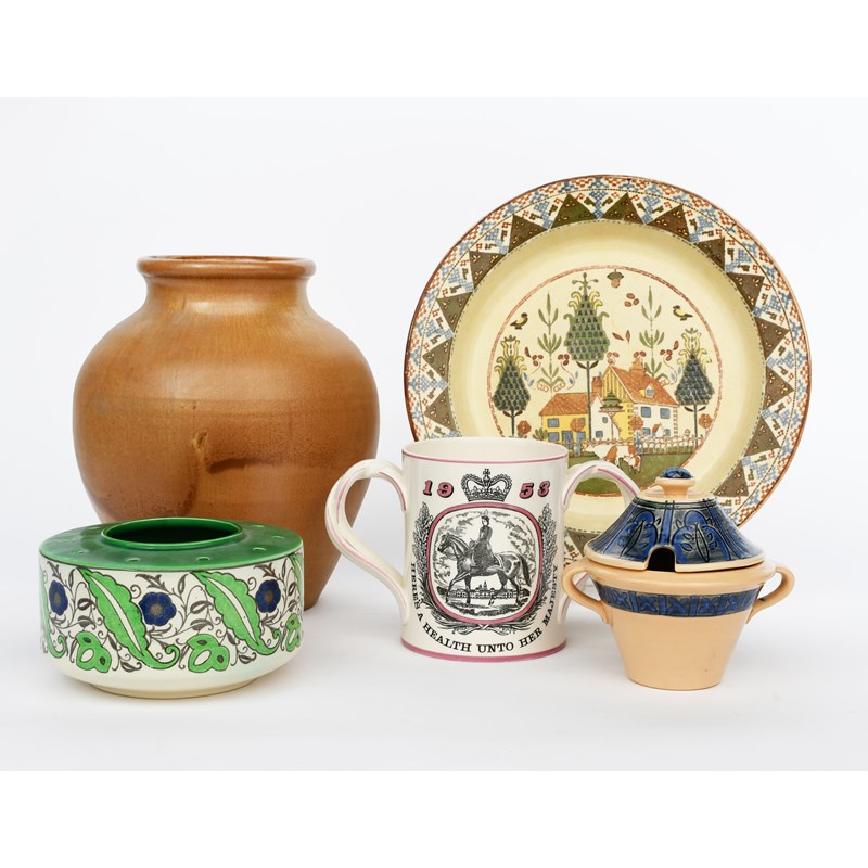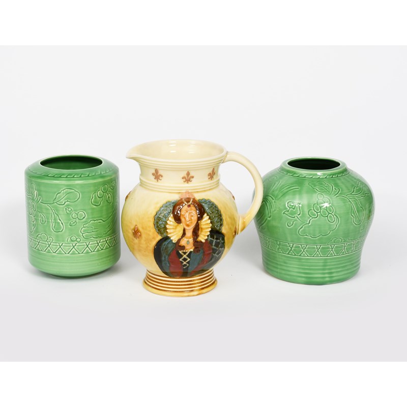 A Royal Doulton Brangwyn Ware small tureen and cover designed by Frank Brangwyn, decorated in low relief with bands of stylised foliage in blue, on a cream ground, two Royal Doulton vases designed by Frank Brangwyn covered in a green glaze, a Royal Doulton Titanium Ware pieces, a Royal Worcester Sabria Ware vase, a Royal Doulton Kings Ware jug, a Royal Doulton Sampler Series Ware large plate, Lady With a Pearl Necklace a Beswick wall plaque, and a collection of ceramics including Doulton, Bullers and Denby Danesby Ware, printed factory marks, V&A paper label, 14cm. high, (a lot)