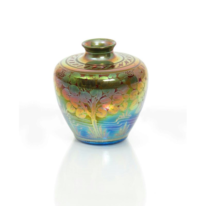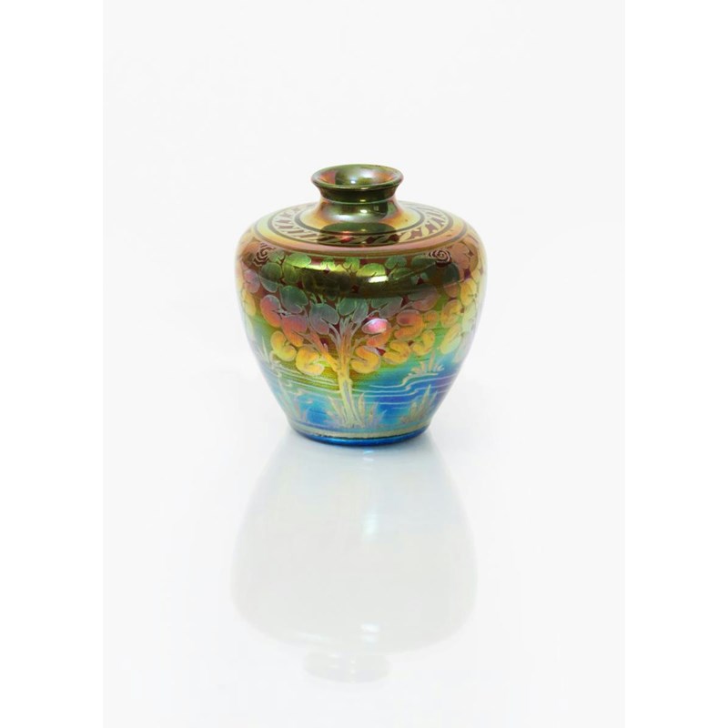 A Pilkington's Lancastrian vase by Charles Cundall, dated 1911, ovoid with collar rim, painted with a frieze of stylised trees, in golden lustre on a red and orange lustre ground impressed mark, painted artist cipher and date code 9.5cm. high