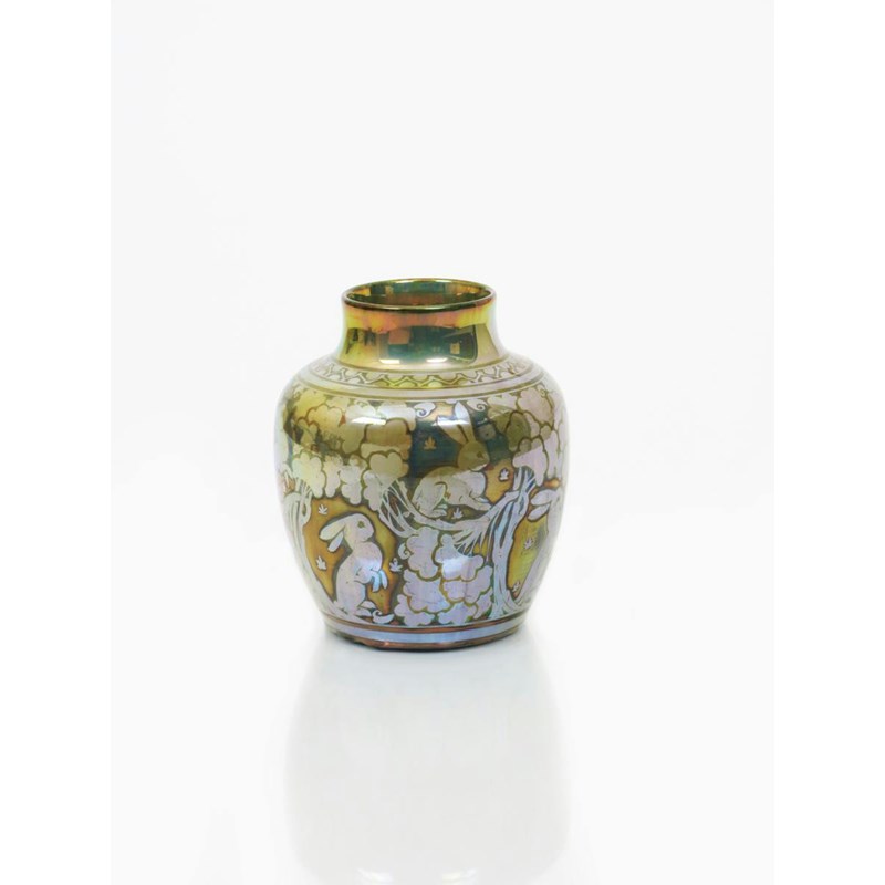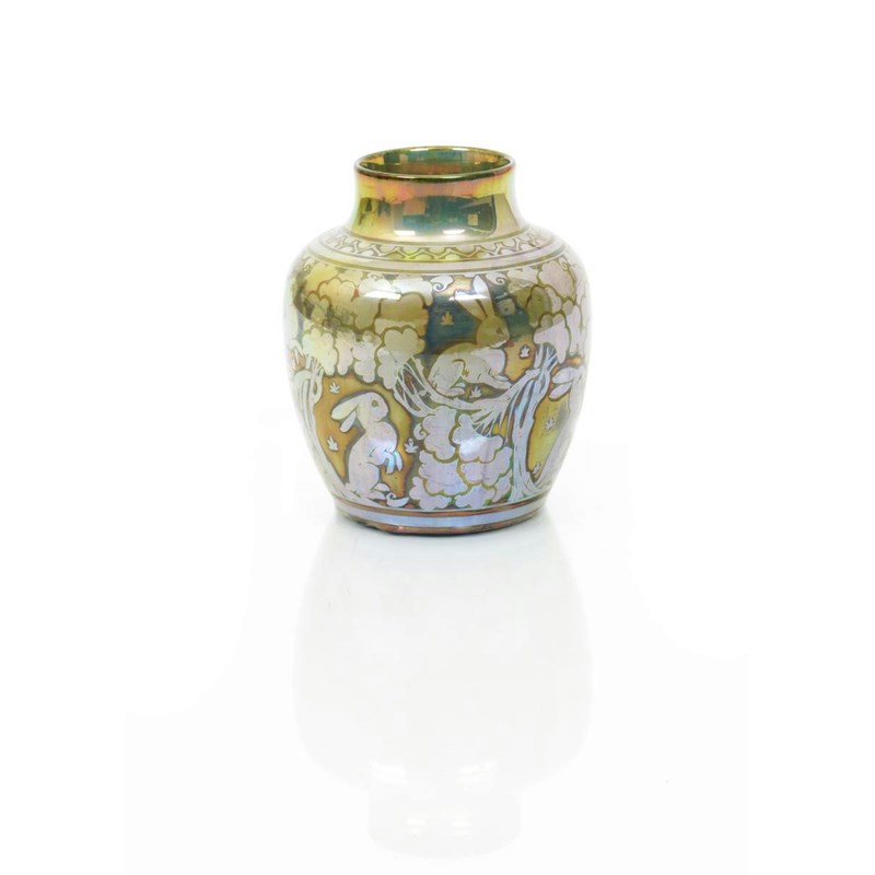 A Pilkington's Lancastrian vase by Charles Cundall, dated 1910, painted with rabbits amidst gnarled trees in golden lustre on a pale blue-green ground impressed marks, painted artist cipher and date code 15.5cm. high