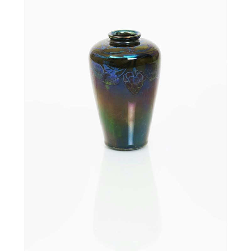A Pilkington's Lancastrian vase by Annie Burton, shouldered form, painted with a band of fruiting grape vine, in ruby and golden lustre on a mottled blue and orange, impressed mark and date mark XII and painted artist cipher 14cm. high