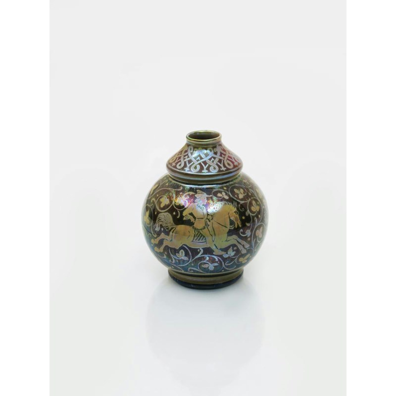 A Pilkington's Lancastrian vase by Richard Joyce, dated 1915, ovoid with swollen neck, painted with medieval mounted huntsmen, between scrolling foliage and birds, in golden lustre on a red and brown streaked lustre ground impressed mark, painted artist cipher and date code 13cm. high