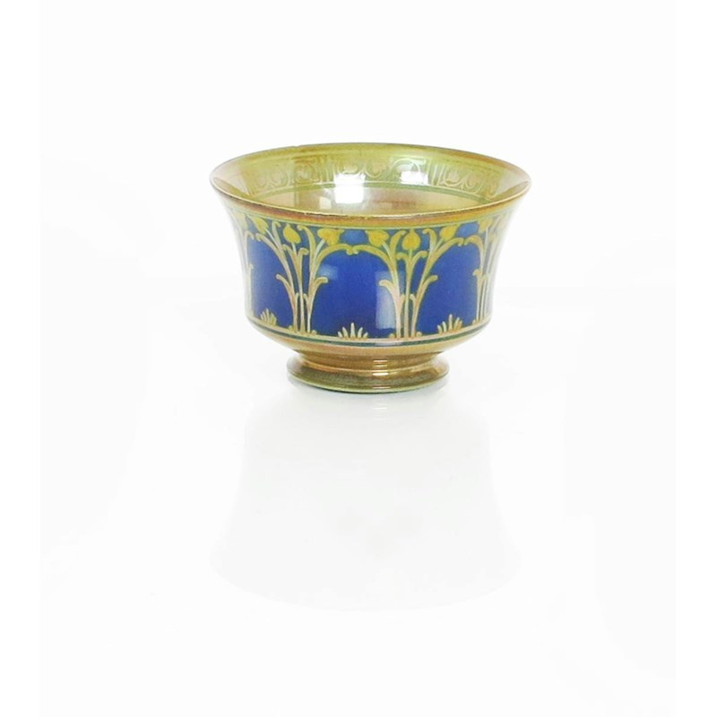 A Pilkington's Lancastrian bowl by Jessie Jones, flaring form, painted with stems of heart-shaped foliage, in golden lustre on a blue ground, the interior glazed gold impressed mark, painted artist cipher, small glaze chip to top rim, 10cm. diam.