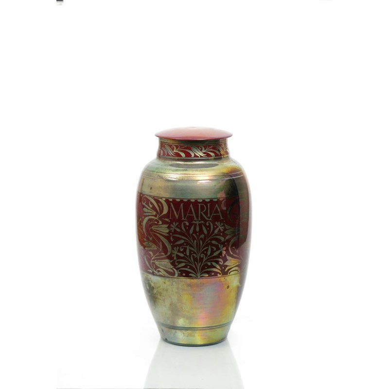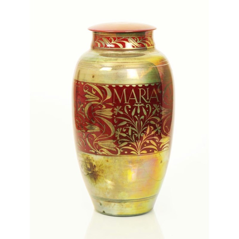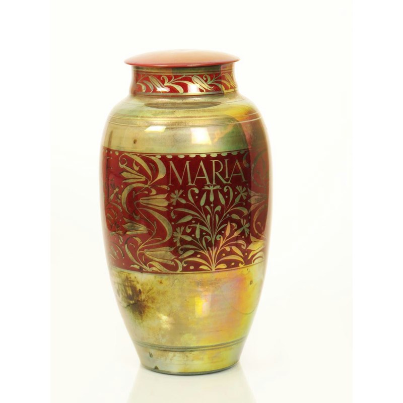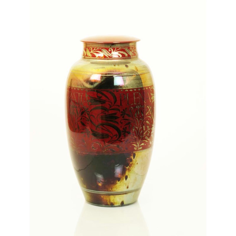 A large Pilkington's Lancastrian vase and cover by Gordon Forsyth, dated 1919, shape no.2229, shouldered form, painted with sprays of carnations and bell flowers below inscription Ave Maria Gratia Plena in golden lustre on a red lustre ground, impressed mark, painted artist cipher and date mark, hairline crack to cover, 44cm. high (2)