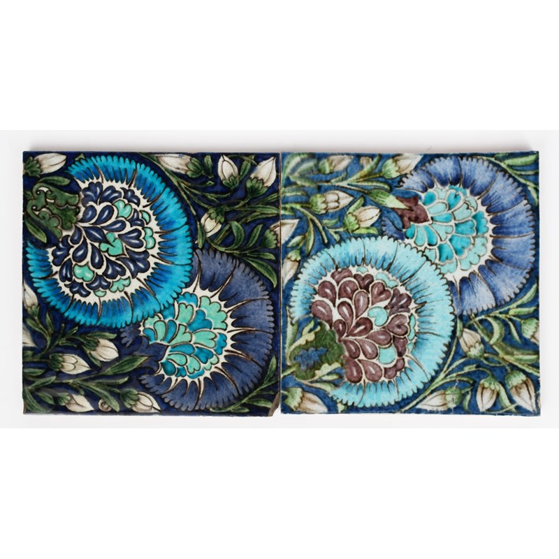 A pair of large William De Morgan Merton Abbey Mongolian pattern tiles, each painted with a Persian flower design in shades of blue, purple and green, impressed marks to reverse, chip to corner of one, 22.5cm. square, (2)