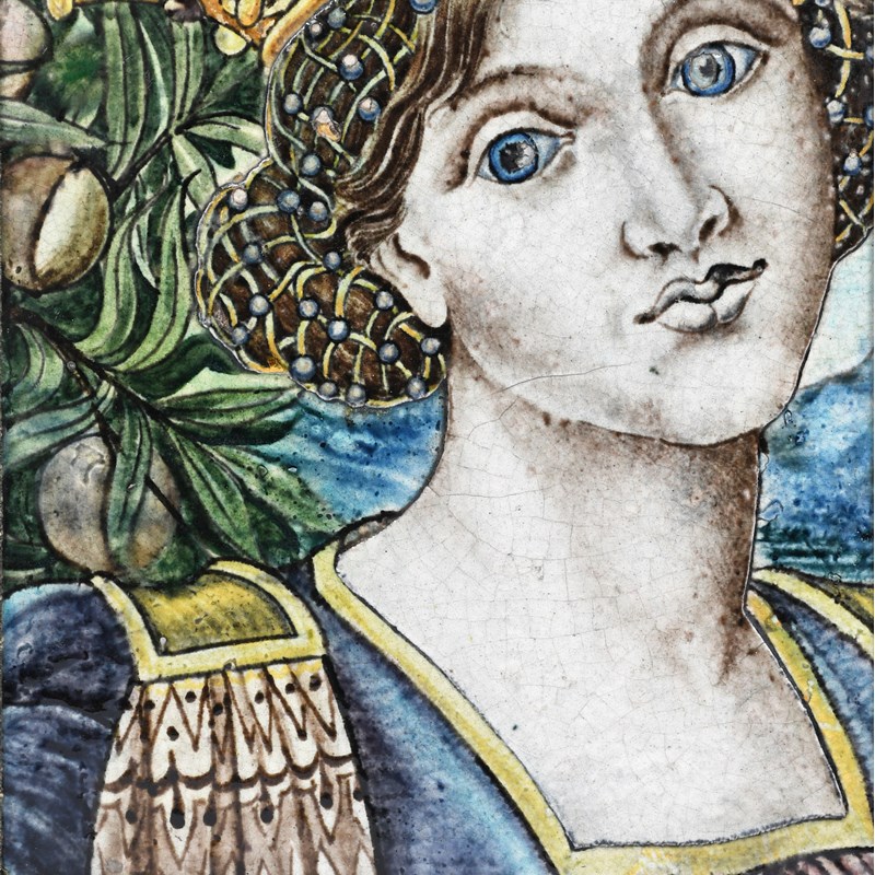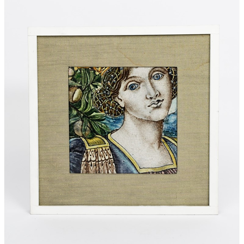 A rare large William De Morgan tile, painted with a portrait of a Renaissance lady, in shades of blue, aubergine, green and yellow, later framed marks concealed, 25cm square tile, (43cm square framed)