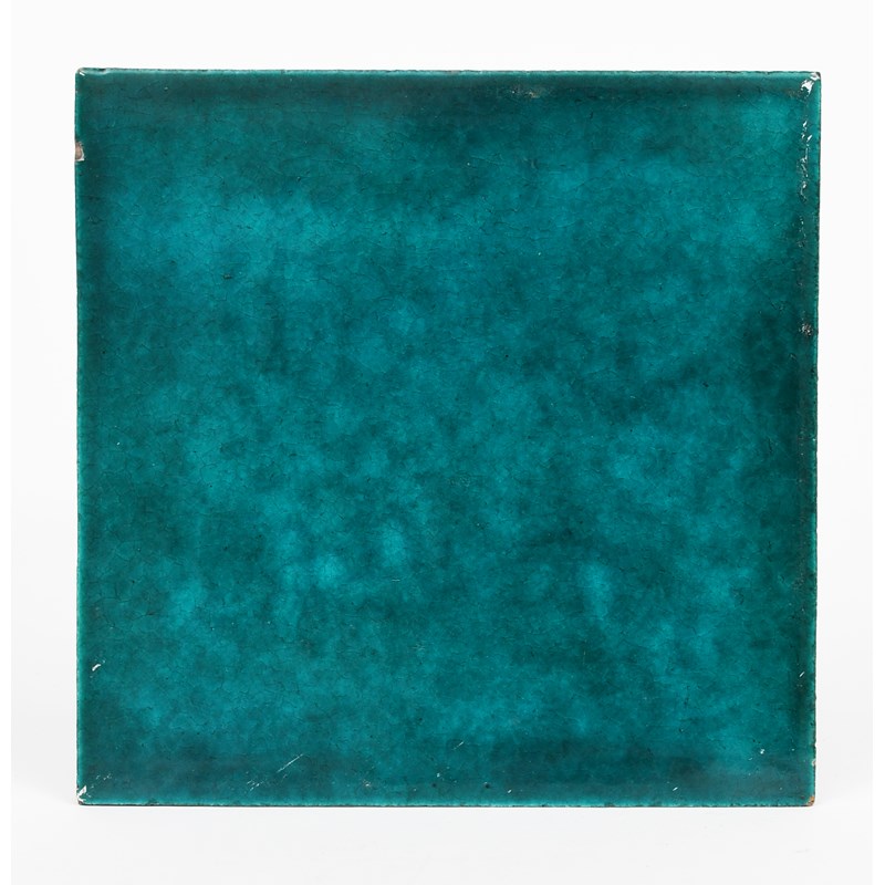 A large William De Morgan Late Fulham Period tile, covered in a turquoise glaze, impressed factory marks, minor glaze chip to rim, 20.5cm. square