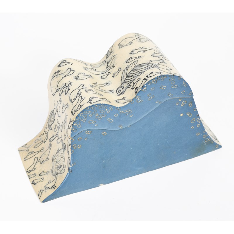 an early box and cover, circa 1974, rectangular tapering section with wavy rim and top, incised with seals and fish, glazed in cream and blue