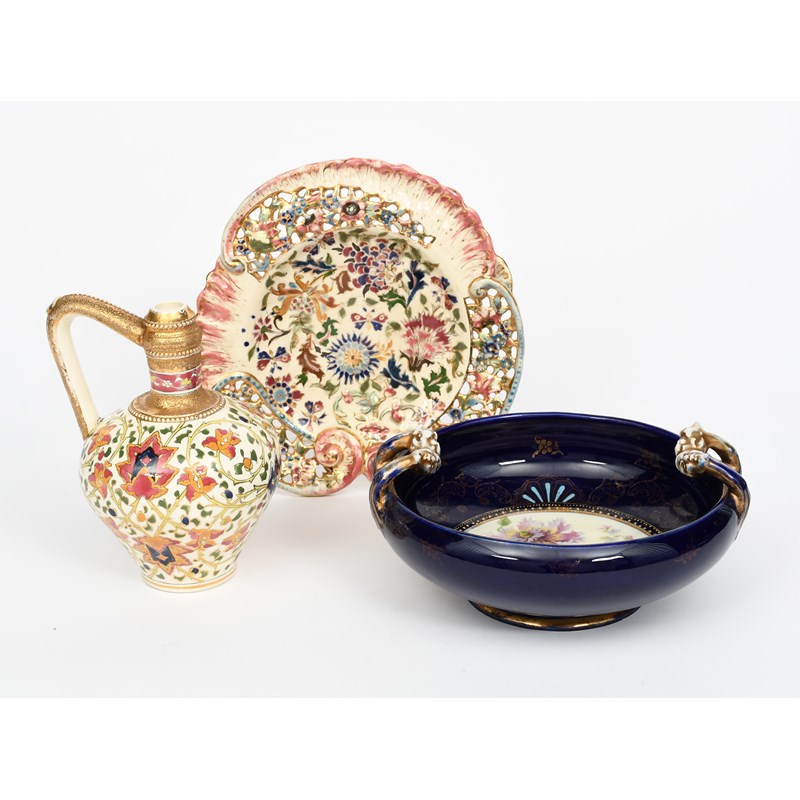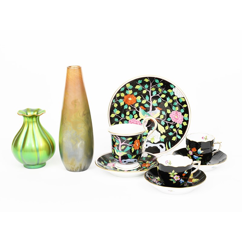 An Art Nouveau Zsolnay Pecs vase, tapering cylindrical form, surface decorated with stylised grasses, in golden and green lustre, a modern Zsolnay Pecs vase covered in a green lustre glaze, a teapot and cover, a Herend hot chocolate cup, saucer and side plate painted with an exotic bird in a tree, three Zsolnay pieces, two Herend cabinet cups and saucers and a collection of ceramics main vase, unsigned, chip to top rim, 22cm. high (a lot)