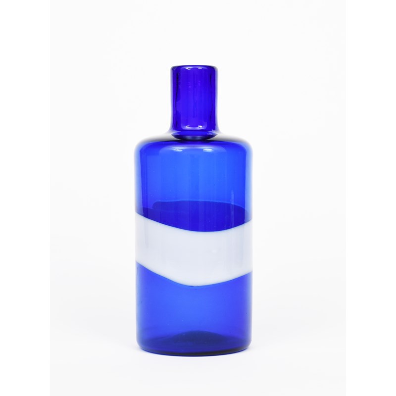 A Venini glass bottle, shouldered cylindrical blue glass with white glass stripe, acid etched Venini Italia Murano to base, 25cm. high