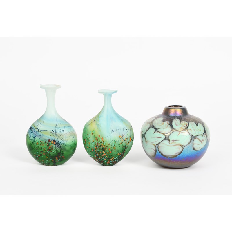 flattened opaque glass disc body with slender neck and everted, wavy top rim, surface decorated in colours, another similar and an ovoid vase with iridescent surface decoration,