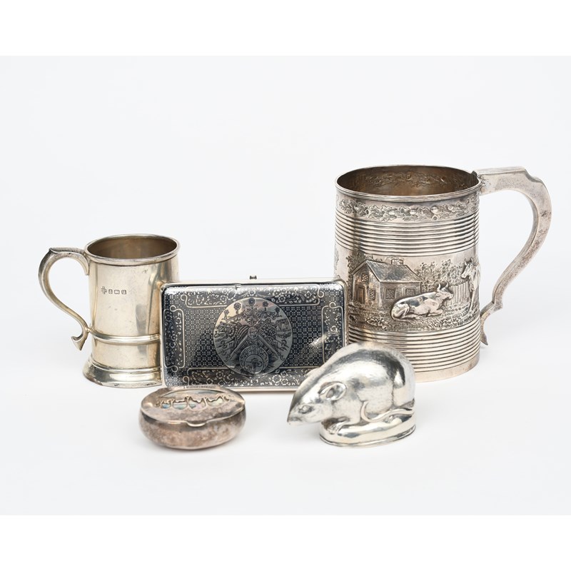 A silver snuff box modelled as a mouse, with hinged cover, a niello cigarette case, a silver tankard, two napkin rings, a smaller tankard, enamelled cigarette case, a silver box and cover, the cover mounted with abalone shell, and a circular box and cover, by various makers, snuff worn stamped marks, 7.5cm. wide, (9)