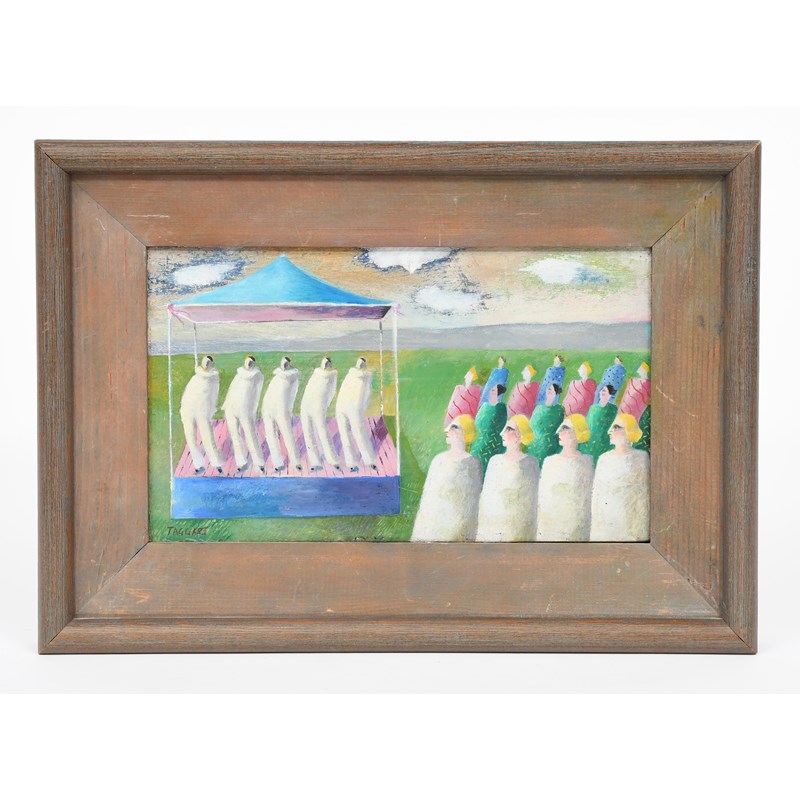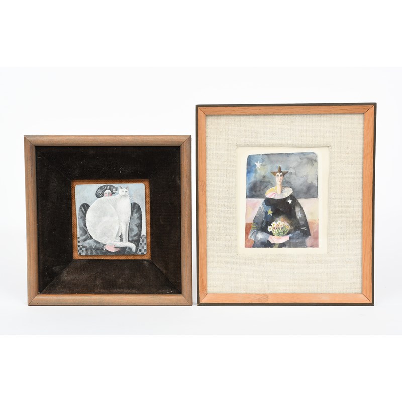 acrylic on board, framed, and Black Pierrot, 1977, Lap Cat, 1980 two other paintings by Elizabeth Taggart and Geese a watercolour by Belinda Fitzwilliams,