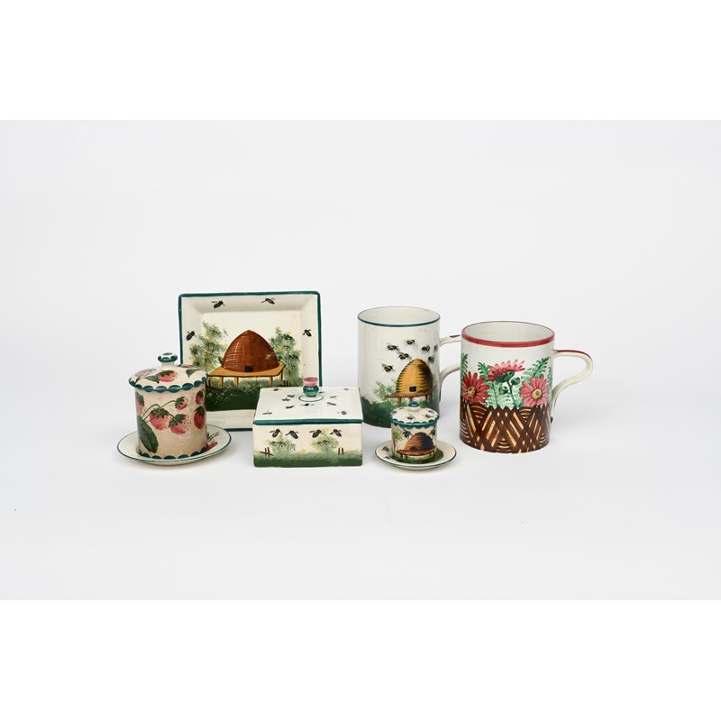 A Wemyss Ware Beehive honey pot and cover on a saucer, painted to side and cover with bees flying around a hive, in colours, a Wemyss Ware large tankard similar, a small cylindrical preserve pot, cover and saucer, a Wemyss Ware strawberry preserve pot, cover and saucer and another tankard painted with flowers above a trellis, painted factory marks, damages and repairs, 18.5cm. square, (11)