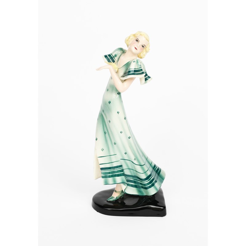 A Goldscheider Pottery model of a lady by Stephan Dakon, model no.6940, modelled standing in low flowing green dress, impressed and printed factory marks and facsimile signature, her right arm and hat missing, 29.5cm. high