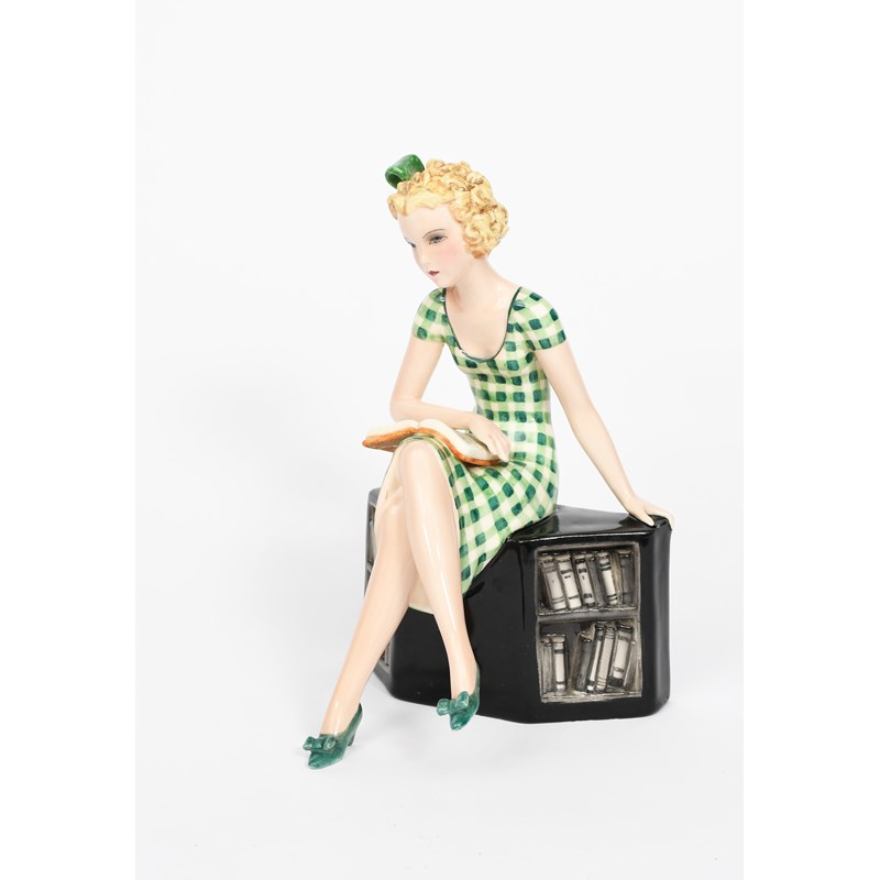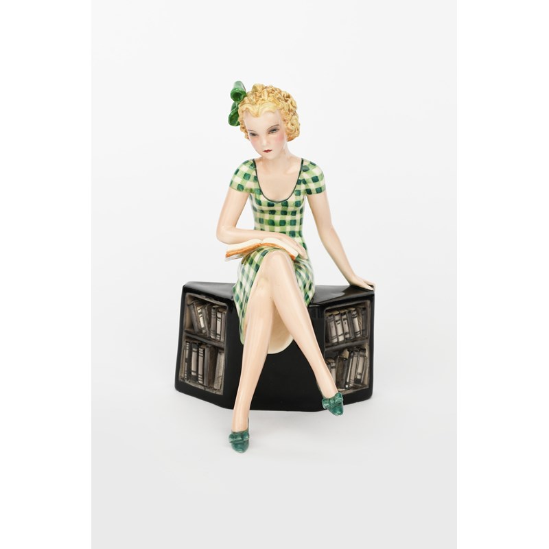 A Goldscheider Pottery model of a young girl designed by Stephan Dakon, model no.7226, modelled seated on a bookcase, looking up from an open book, glazed in colours impressed and printed factory marks and facsimile Dakon signature, small glaze chip to bookcase corner, 24cm. high