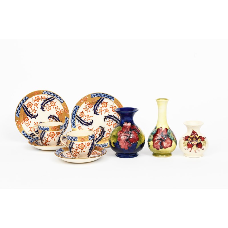 'Hibiscus' a Moorcroft Pottery solifleur vase designed by Walter Moorcroft, tubeline decorated in green and pink on a yellow ground, another Moorcroft Pottery 'Hibiscus' vase, an 'Aquilegia' vase and two James Macintyre Aurelian Ware cups, saucers and side plates, impressed factory marks, 15.5cm. high (9)