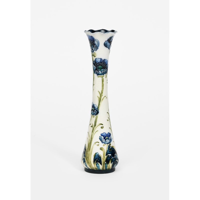 A James Macintyre & Co Florian Ware solifleur vase designed by William Moorcroft, waisted form with fluted rim, tubeline decorated with flower stems in blue and green on a white ground, printed factory marks, painted green signature, professionally restored top rim, 19.5cm. high