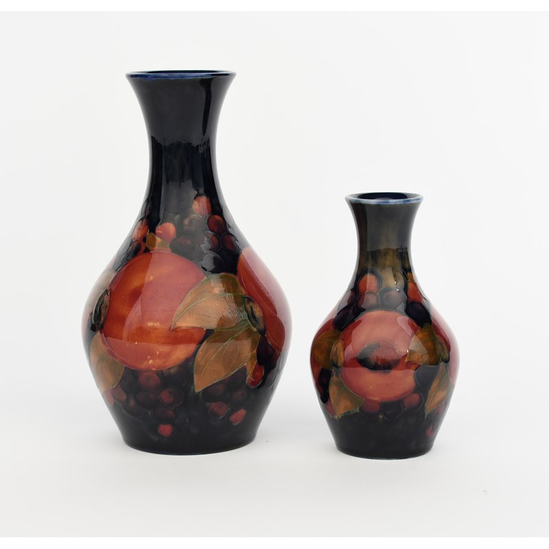 'Pomegranate' a Moorcroft Pottery vase designed by William Moorcroft, ovoid with waisted cylindrical neck, tubeline decorated in shades of red, purple, green and ochre on a blue ground, and another smaller, impressed factory marks to both, taller vase with green facsimile signature, 21cm. high (tallest), (2)