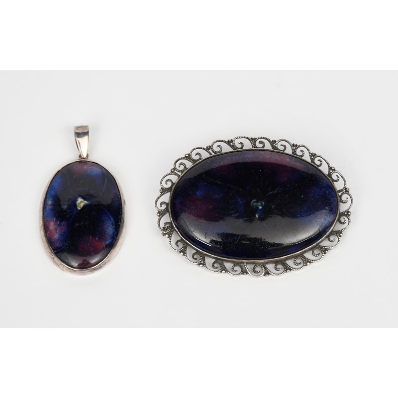 'Pansy' a Moorcroft Pottery silver mounted brooch designed by William Moorcroft, elliptical panel painted in blue, purple and yellow, set in silver filigree frame, and another 'Pansy' pattern Moorcroft pendant necklace brooch stamped marks, L & Co, Birmingham 1942, 5.5cm. wide, (2)