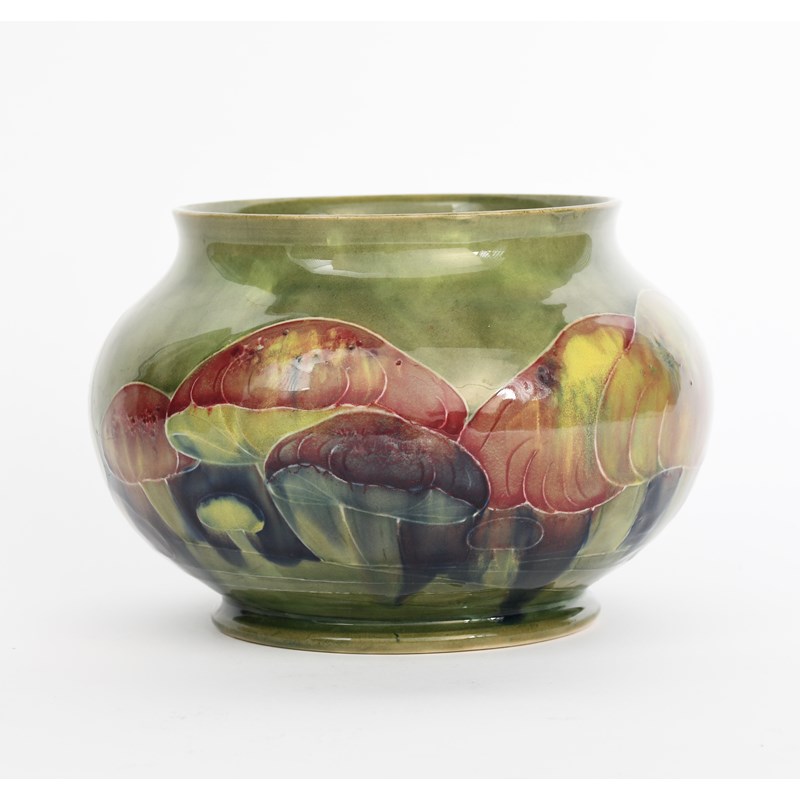 'Claremont' a Moorcroft Pottery jardiniere, ovoid with everted top rim, tubeline decorated with a frieze of mushrooms, in shades of red, yellow and blue on a green ground, impressed marks, painted green signature, stress star hairline to base, 12.5cm. high