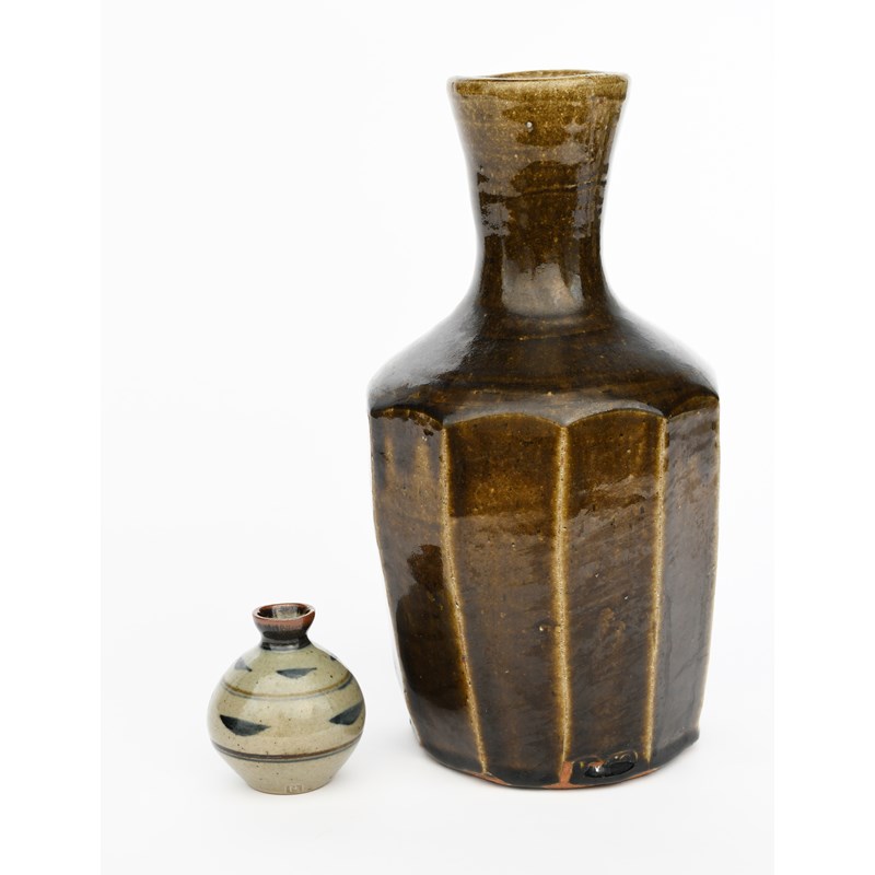 a Leach Pottery cut sided vase with cylindrical neck, covered in an olive green glaze to the foot, and a small Lowerdown Pottery vase, ovoid covered in a celadon glaze with blue brushed design,