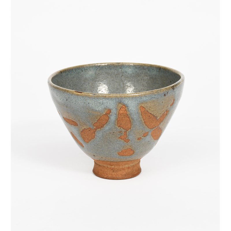a small stoneware footed bowl, resist decorated with brush stroke abstract design, speckled blue and celadon glaze to the foot,