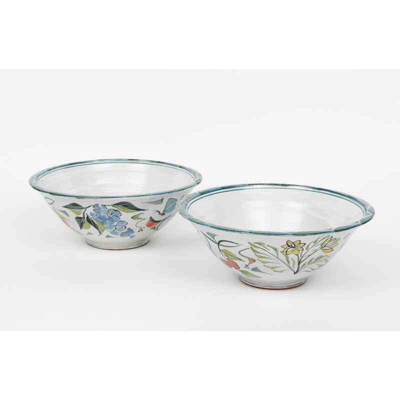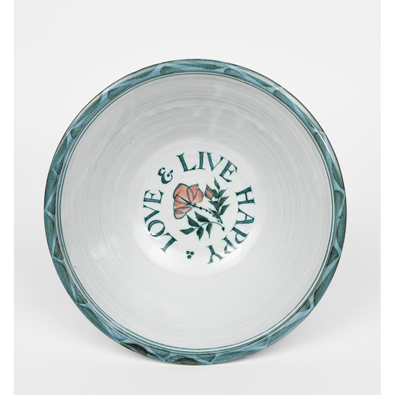 a pair of Aldermaston Pottery bowls, painted to the well with the inscription Love & Live Happy, around central flower stem, the exterior a band of stylised flowers and foliage in colours on a tin-glaze,