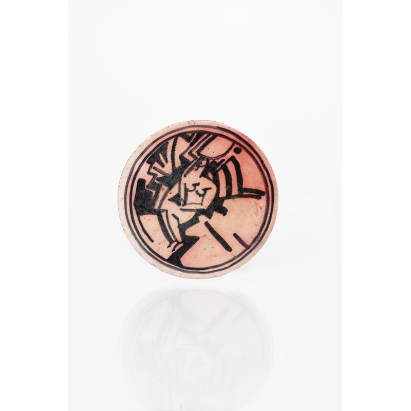 a ceramic roundel probably made at the Yeoman Pottery, painted with a Vorticist figure in black on a pink and white ground