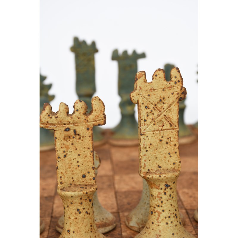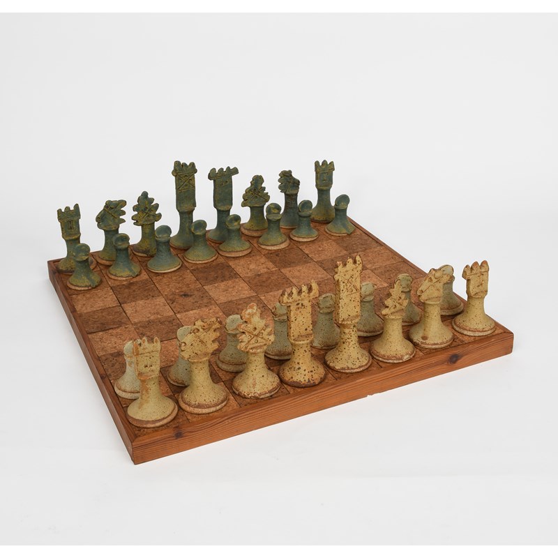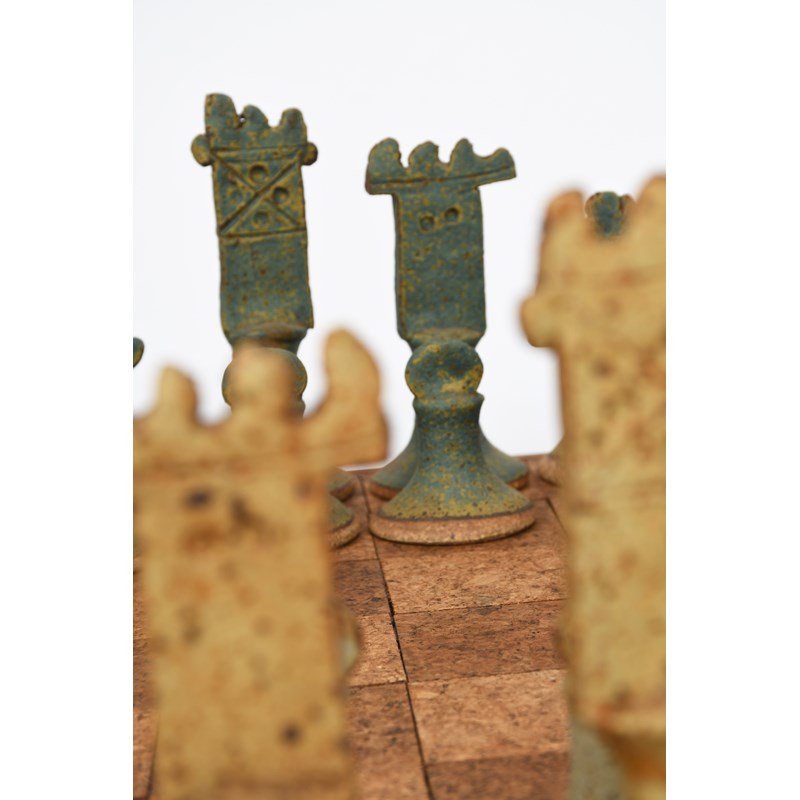 an early stoneware chess set and board, glazed in shades of green and oatmeal, the board cork and pine,