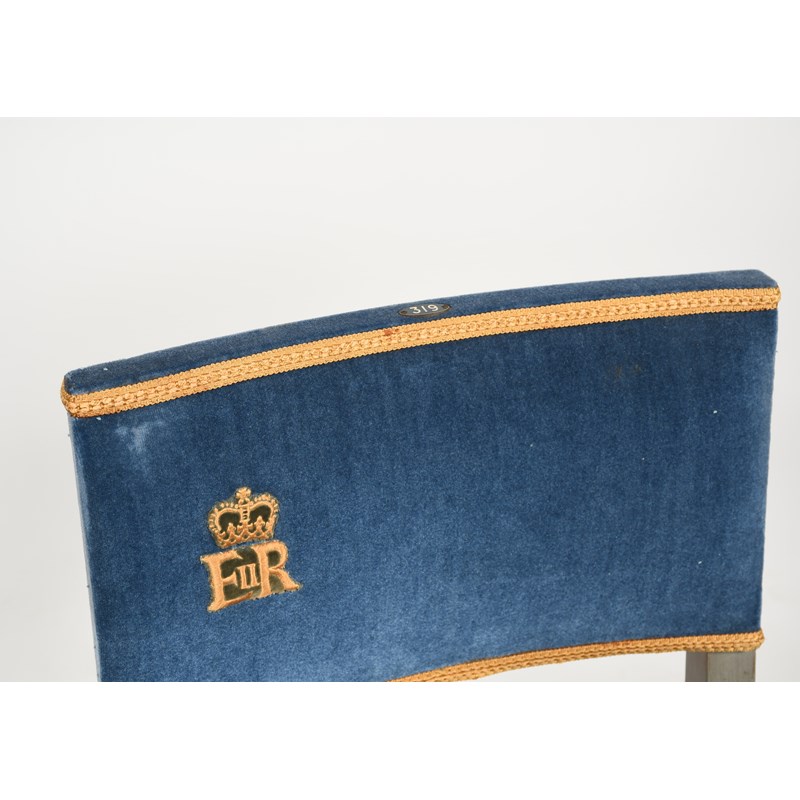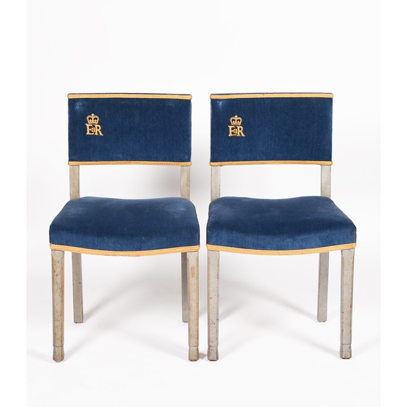A pair of W Hand & Sons ER II Coronation 1953 chairs, painted grey frame with blue velvet upholstery embroidered with ER monogram, applied 233 and 319 seat numbers to back rest, stamped marks to frame, 85cm. high (2)