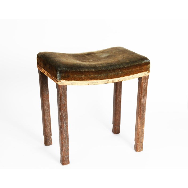 A Maple & Co limed oak George VI Coronation foot stool, 1937, rectangular form with blue/green velvet seat stamped GR VI Coronation Maple & Co London to underside, 48cm. high