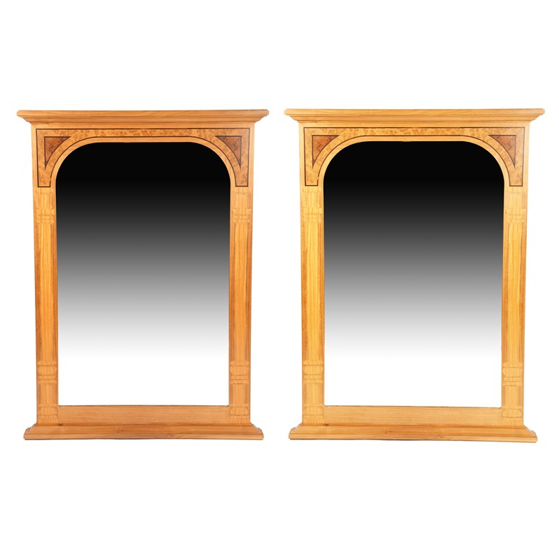 A pair of David Linley large wall mirrors, dated 1996, rectangular cherry wood with flaring mantel and base, marquetry decorated with pillars and pierced brackets, impressed David Linley 1996, 149.5cm. high, 110cm wide, (2)