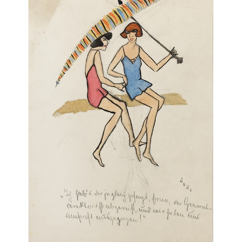 watercolour, pen and ink on paper, depicting two young women in bathing suites, under a large striped parasol, mounted