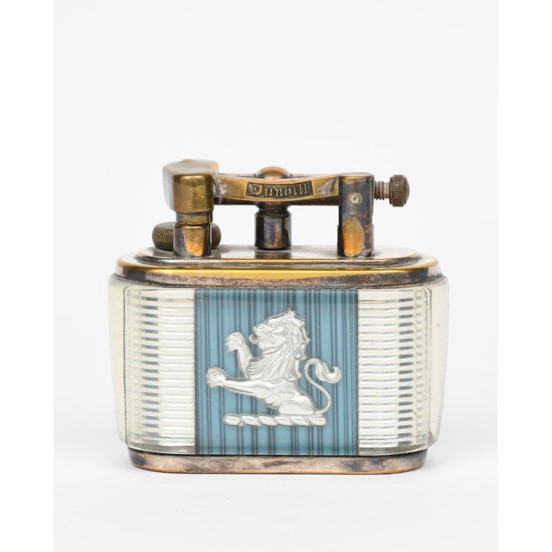 A Dunhill Joseph Lucas advertising table lighter, the perspex panels decorated with lion rampant in silver on a ribbed blue ground, cast mark Dunhill, base cast marks Plastics and Styling by Joseph Lucas Ltd Birmingham England 10cm. wide