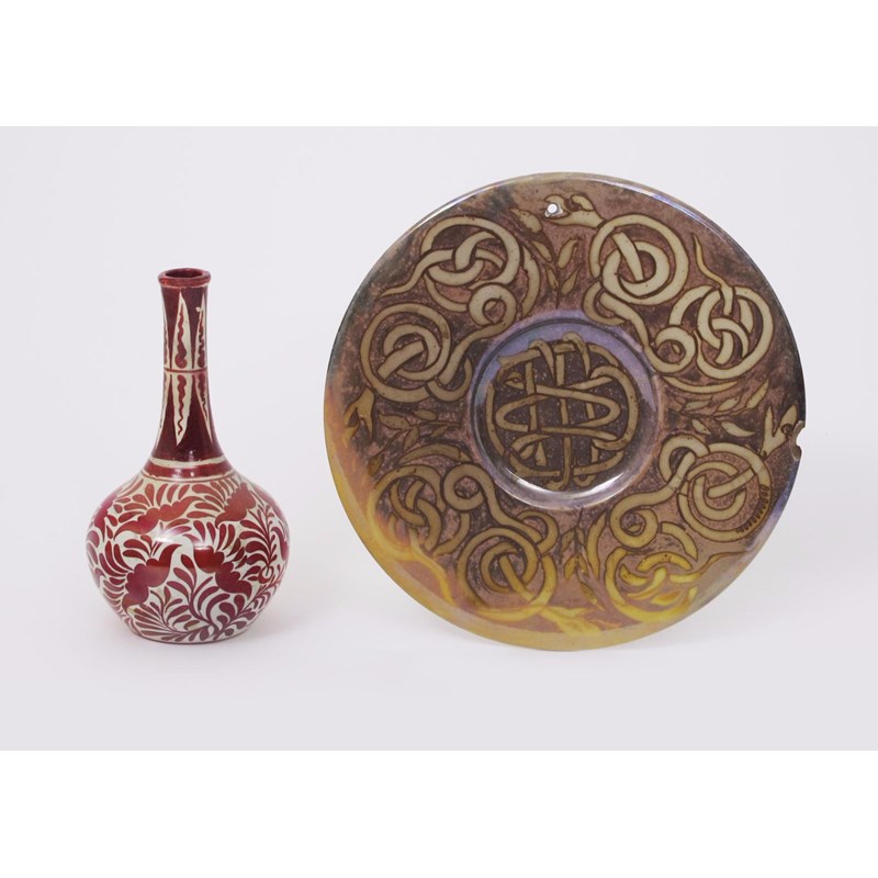 A William De Morgan rice dish, painted with a Celtic knot to the well, the rim with entwined Celtic snakes, covered in a golden lustre, and a small William De Morgan bottle vase painted with flowers, and two books on William De Morgan bottle vase has impressed tulip mark, dish unmarked, damages 21.5cm. diam (4)