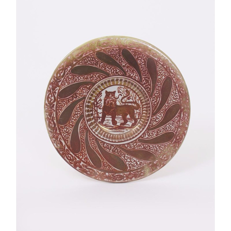 A William De Morgan Pottery charger, on John Heath Davis blank, painted to the well with a lioness alert, her front paw raised, inside radiating foliate border, in ruby lustre impressed J H Davis mark, 30.5cm. diam.