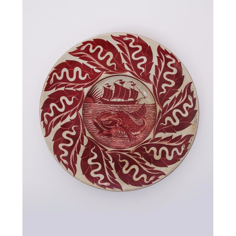 A William De Morgan charger, on Davis blank, painted to the well with a galleon at full sail, sailing past a setting sun on the horizon, the foreground with a classical dolphin, in ruby lustre on a white ground, the rim with a frieze of snake and leaf, the reverse painted with stylised foliage impressed mark, 30.5cm. diam.