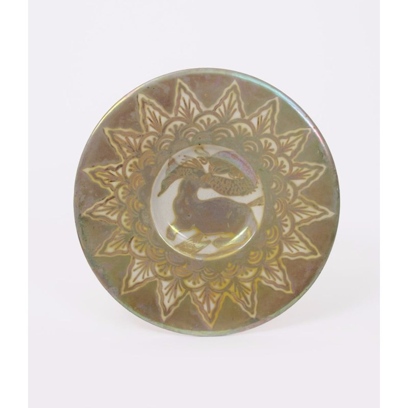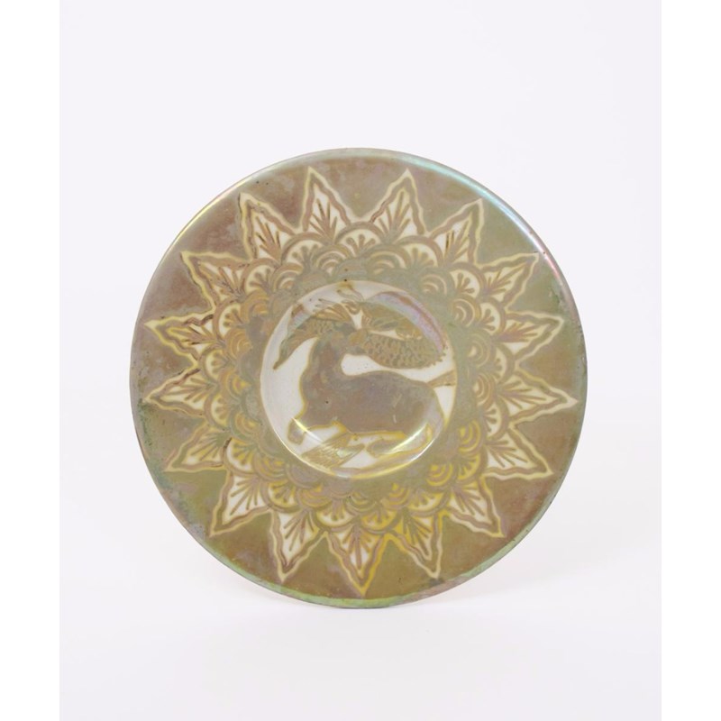 A William De Morgan Pottery charger, on John Heath Davis blank, painted to the well with an otter holding a huge fish in its mouth, the rim with radiating foliate design, in golden lustre, impressed J H Davis mark 30.5cm. diam.