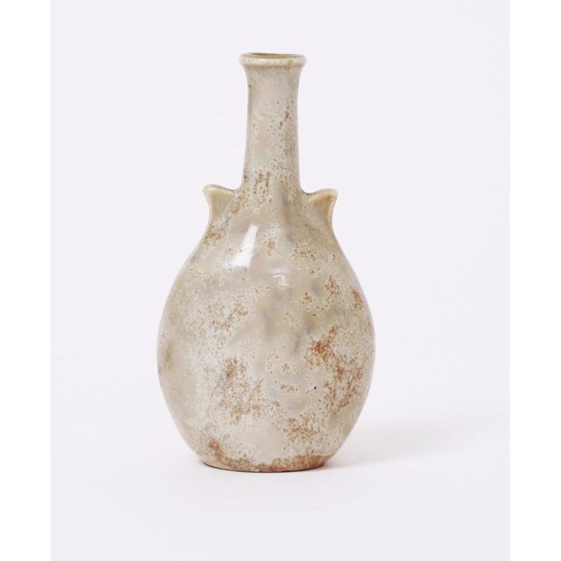 A Martin Brothers stoneware gourd vase by Edwin & Walter Martin, dated 1902, the flattened disc body with pulled lug handled and solifleur stem, covered in a cream glaze over mushroom, incised 12-1902 Martin Bros London & Southall, 9cm. high