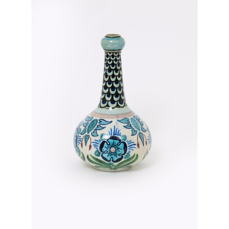 A Burmantoft's Faience Anglo Persian bottle vase designed by Leonard King, painted with a frieze of stylised dog rose flower, the tapering neck with overlapping scale decoration, in shades of blue, turquoise, pink and green on a white ground impressed and painted factory marks, painted LK monogram, minor professional restoration to the top rim, 20.5cm. high