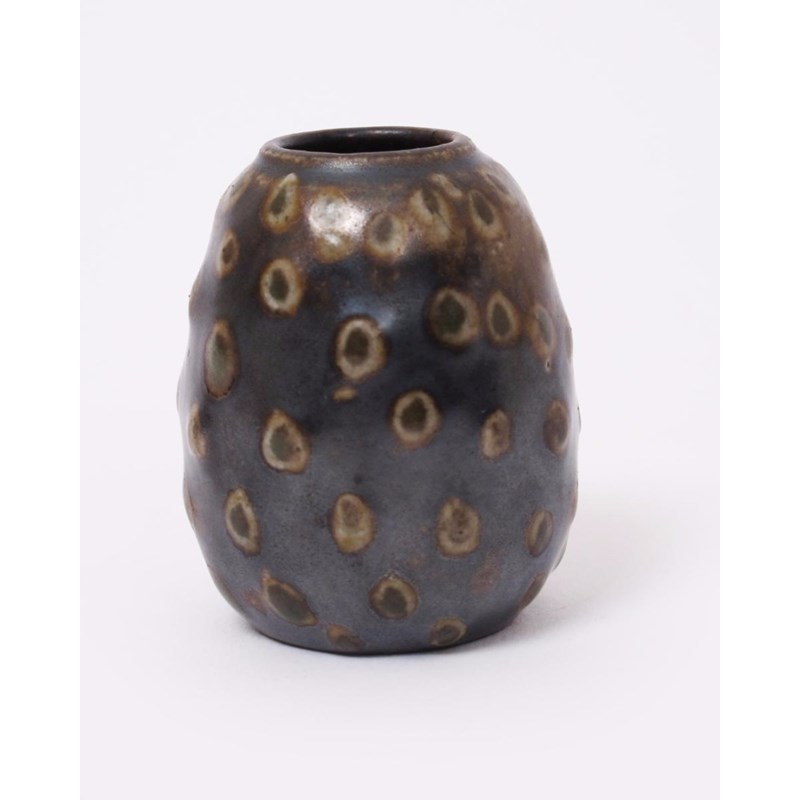 A Martin Brothers stoneware gourd vase by Edwin & Walter Martin, dated 1914, shouldered cylindrical form, modelled in low relief with spots, glazed dark brown/black highlighted with green spots incised 3-1914 Martin Bros London & Southall 5.5cm. high