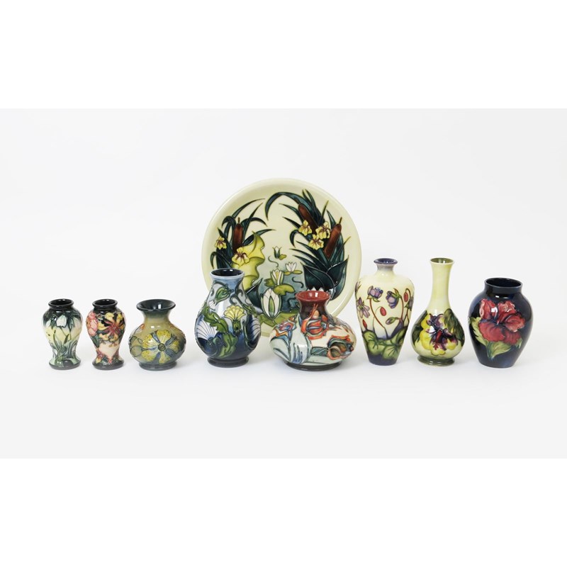 'Red Tulip' a Moorcroft Pottery vase, compressed form painted in colours, a 'Carnation' vase, a 'Bullrush' plate, two Hibiscus' vases and four other vases printed and painted marks, 11cm. high (9).