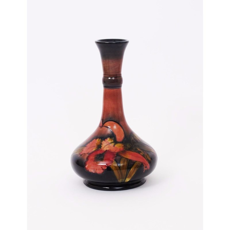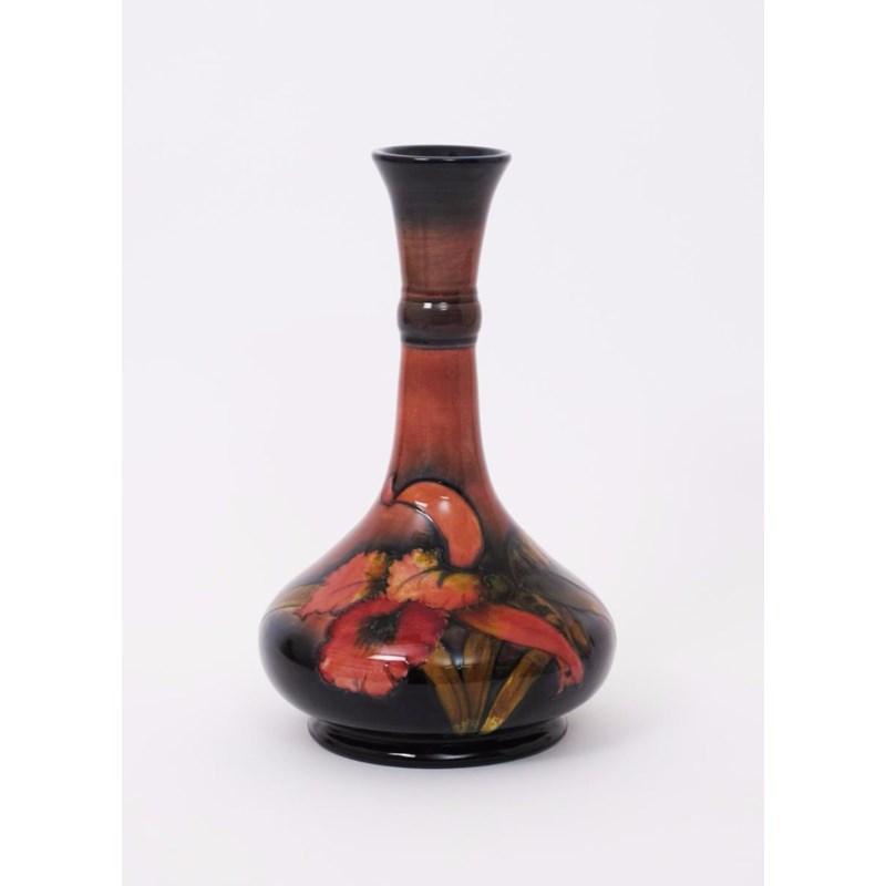 'Flambe Frilled Orchid' a Moorcroft Pottery lamp base designed by William Moorcroft, compressed body with tapering cylindrical neck, painted in colours under a light flambe glaze impressed marks, painted green signature and paper label 32cm. high