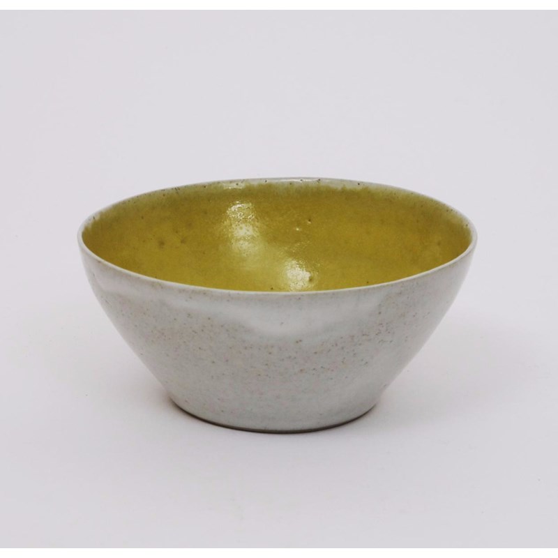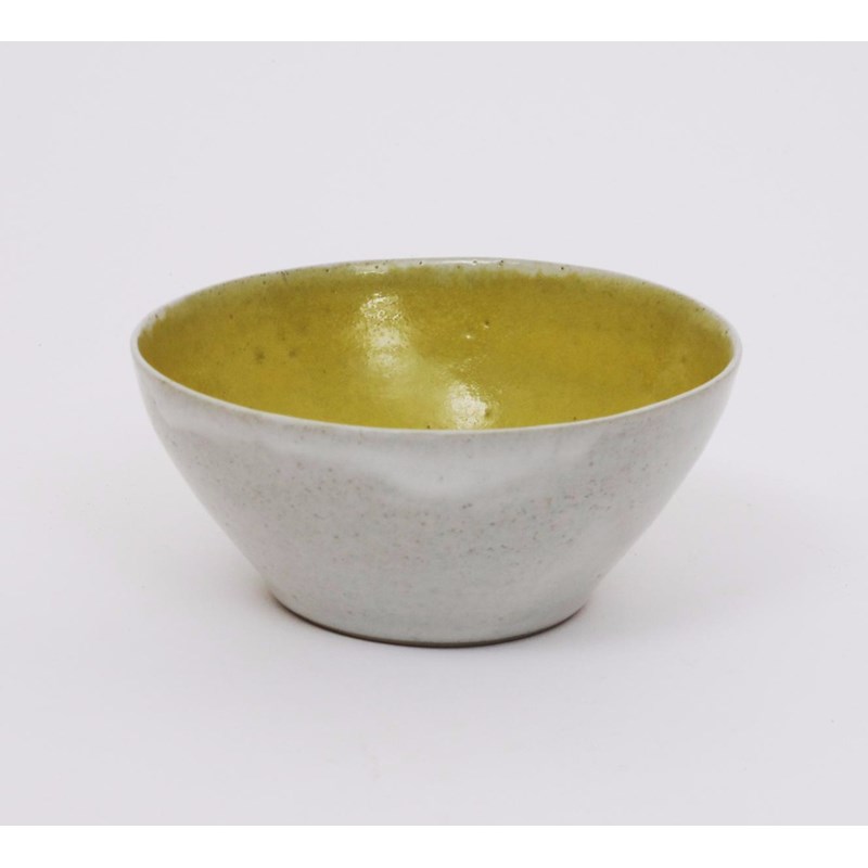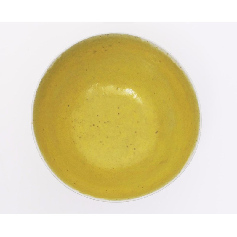 an early stoneware bowl, flaring slightly elliptical form, glazed yellow to the interior, the exterior off white impressed LR seal mark, 14.5cm. wide
