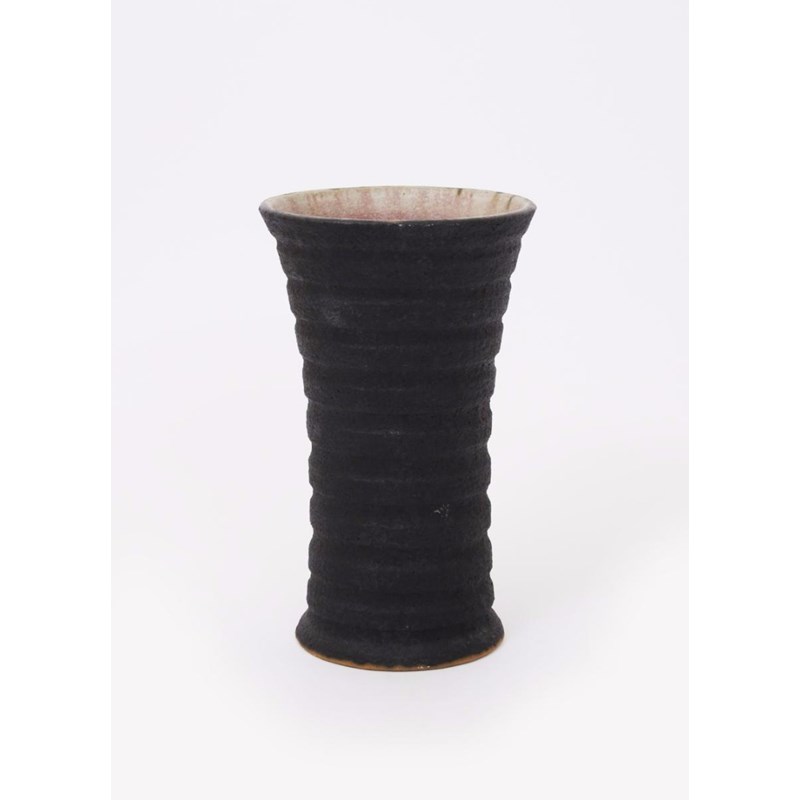 a ribbed, waisted cylindrical stoneware vase, the exterior glazed matt black, the interior streaked pink and sky blue impressed seal mark, 28cm. high