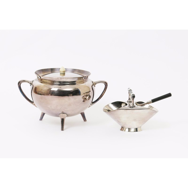 λ A Walker & Hall electroplated sugar basin and shovel designed by Dr Christopher Dresser, model no.119, the shovel with ebonised wood handle, and an electroplated tureen and cover with ivory finial in the manner of Dr Christopher Dresser stamped marks, basin 16.5cm. wide (2).