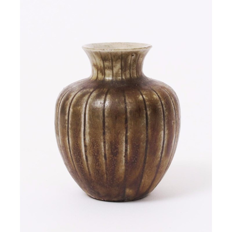 A Martin Brothers stoneware gourd vase by Edwin & Walter Martin, ovoid with everted rim and modelled vertical ribs, covered in a silver-grey glaze with olive green, incised 1896 C W.F Martin No.56 8cm. high